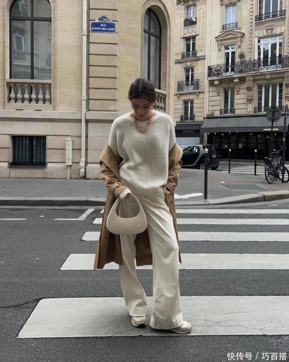 秋风送爽的秋天,大家可以选择针织毛衣与白色长裤搭配,像博主一样选择顺色搭配干净清爽,既能破解秋天的萧瑟又能穿出让人一眼看上去就暖暖的效果。