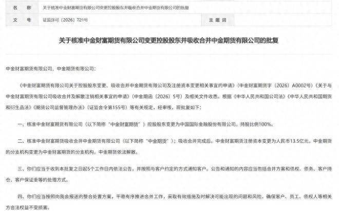 4月8日,中国证监会官网公布《关于核准中金财富期货有限公司变更控股股东并吸收合并中金期货有限公司的批复》。